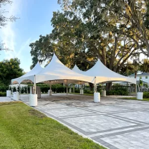20′ x 20′ High Peak Frame Tent – a versatile, compact frame tent ideal for smaller gatherings, cocktail setups, and backyard celebrations where a freestanding structure is needed without the footprint of a larger tent.